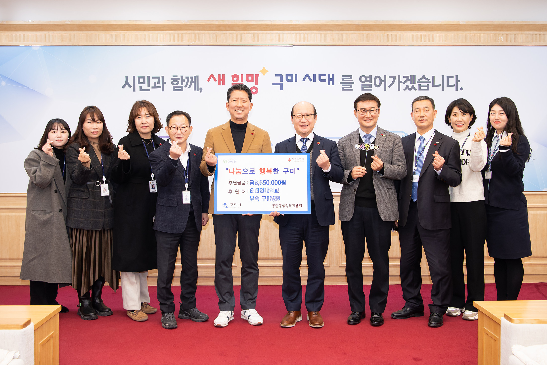 [구미인터넷뉴스]구미시(시장 김장호)에서는 12월 30일 순천향대학교부속 구미병원 정일권 병원장과 임직원, 송조호 공단동장 등이 참석한 가운데 시청 국제통상협력실에서 이웃돕기 성금 기탁식을 가졌다.